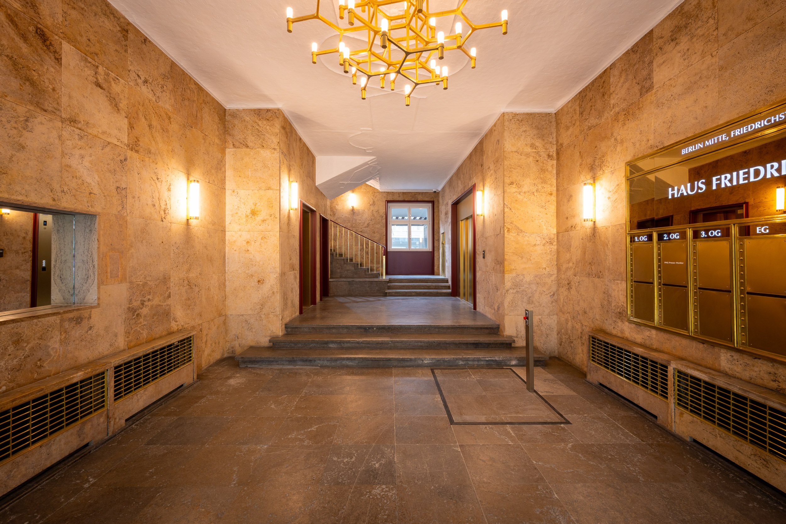 Das Haus Friedrichstadt als ein denkmalgeschütztes Büro- und Geschäftsgebäude im Stil spätexpressionistischer moderner Architektur der 20er Jahre liegt an der Friedrichstraße in Berlins Mitte. Im zentralen Eingangsfoyer und Haupttreppenhaus sind bauzeitliche Marmorbekleidungen sowie Decken im Stil des Art Déco und Messingbauteile im Original erhalten. Über der ebenerdigen Geschäftsetage liegen die leicht auskragende Bel Etage mit großzügiger Verglasung sowie vier weitere Obergeschosse für Büronutzung. Die Revitalisierung, nach Umbauten und Sanierung in den 50er und 90er Jahren, erfolgt in enger Abstimmung mit dem Denkmalschutz. Die einzigartigen Qualitäten des repräsentativen historischen Gebäudes verbinden sich mit der vollständig erneuerten technischen Ausstattung, so dass die Nachhaltigkeitszertifizierung gemäß Leed-Gold- Standard erreicht wird. Die Neustrukturierung der Sanitärkerne sowie die brand- und schallschutztechnischen Maßnahmen schaffen die Grundlage für konventionelle Büro-Raumaufteilungen mit Mittelflur bis hin zu großzügigen Open Space-Lösungen.