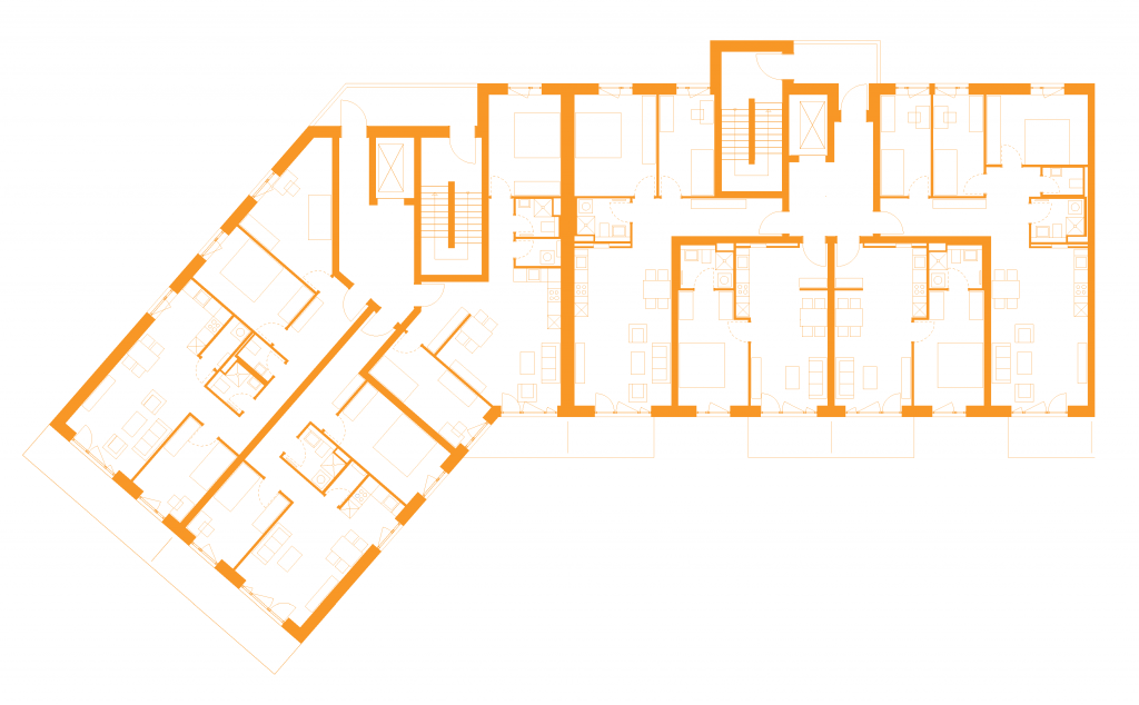 Um möglichst kostengünstig Wohnraum zu schaffen, hat unser Planungsteam effiziente Wohnungstypen entwickelt, die in den einzelnen Häusern immer wiederkehren. Die Grundrisse sind so organisiert, dass nur ein Versorgungsschacht pro Wohnung benötigt wird. Die Badezimmer dienen als zentrale Versorgungseinheiten, sie wurden einschliesslich Installation als vorgefertigte Raum-Module geplant. Jede Wohnung verfügt zudem über einen Freisitz mit vorwiegend Südorientierung. Um den Mietern im Erdgeschoss Terrassen mit Grünflächen zu ermöglichen, wurde bewusst auf Feuerwehrzufahrten auf dem Gelände der Wohnanlage verzichtet. Der Brandschutz wird über Sicherheitstreppenräume auf der Nordseite realisiert. Diese bewirken, dass Erschliessungsflächen und die Anzahl der benötigten Aufzüge reduziert werden können.