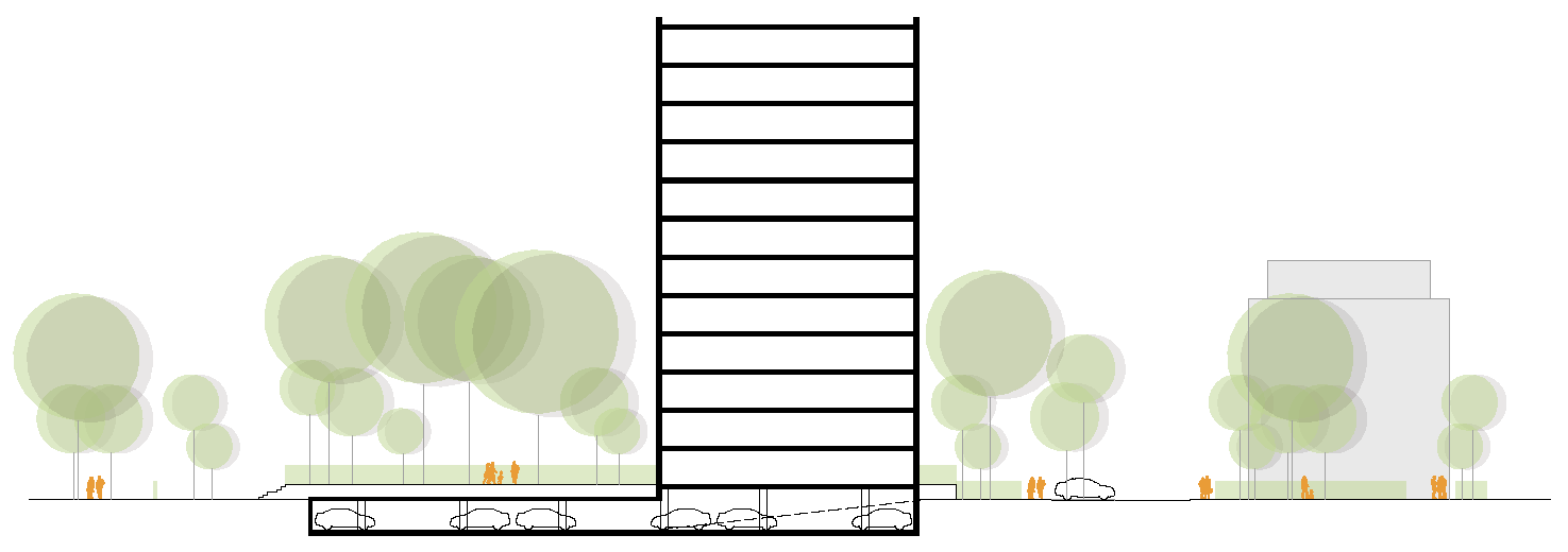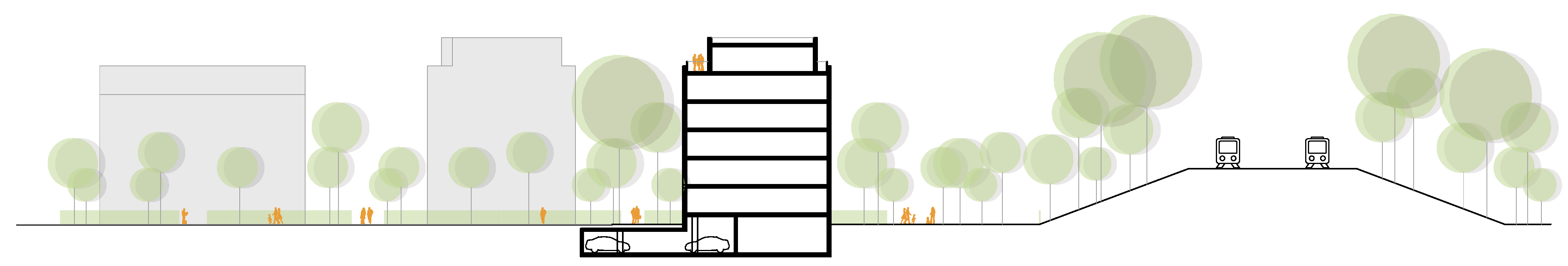 Abwechslung entsteht auch durch das Zusammenspiel verschiedener Typologien, die das Gebiet untergliedern und prägen. Durch wechselnde Ausrichtung von Vier- und Fünfspännern in horizontale und vertikale Richtung werden Einblicke vermieden und Ausblicke ermöglicht. Dies trägt, wie auch die direkte Zugänglichkeit zu den Tiefgaragen, zu einer hohen Wohnqualität bei.