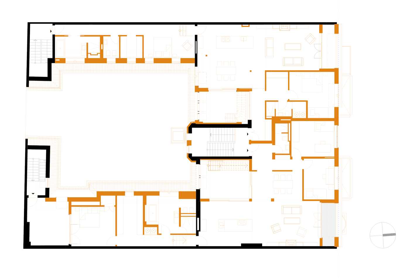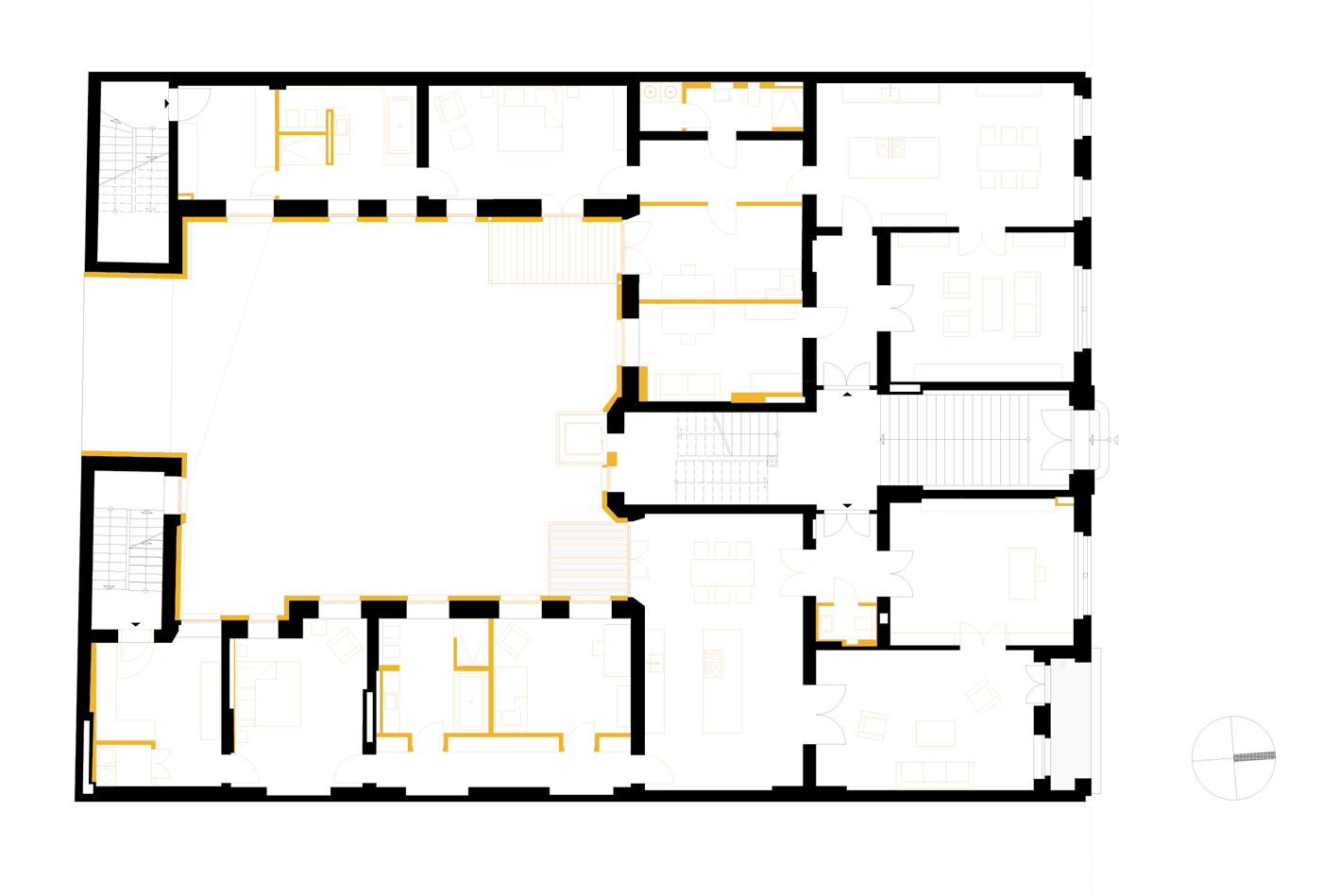 So existieren nun zehn Wohneinheiten in den Obergeschossen und zwei Büroeinheiten im Erdgeschoss. Neue Balkone und ein Aufzug werten die Wohnsituation auf. Die Bestandserhaltung stand während der Baumassnahmen im Vordergrund. So wurden die alten Holzfenster und -tore aufgearbeitet und nur die Verglasung ersetzt, um dem heutigen energetischen Stand zu entsprechen.