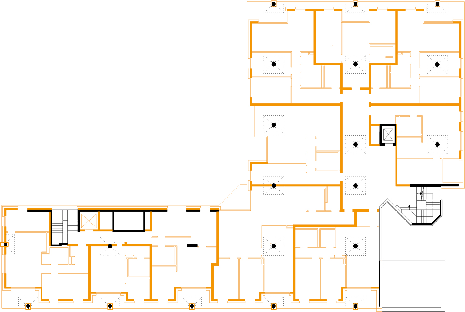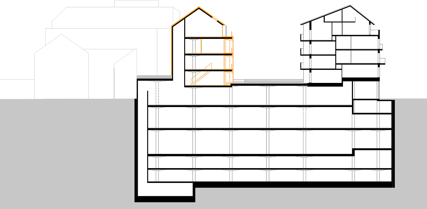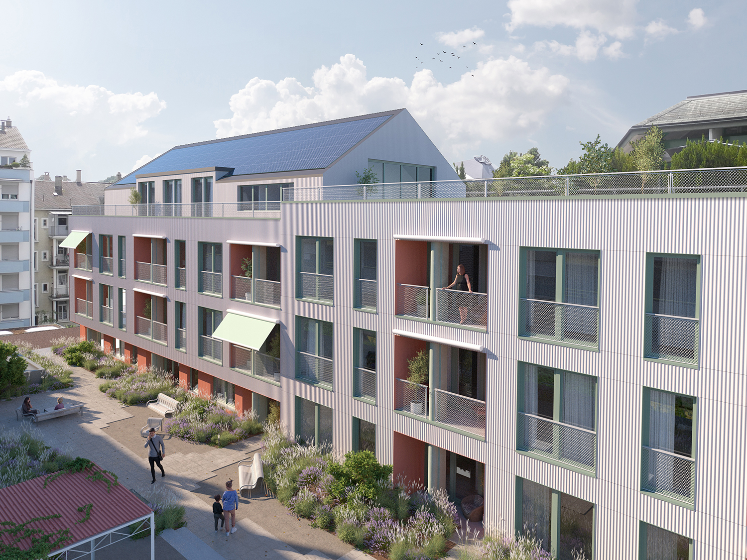 Die vorhandene Struktur besteht aus Stahlbetondecken und markanten Pilzkopfstützen. Die Struktur bleibt mit der Umnutzung vollständig erhalten und bildet das Grundgerüst für hochwertige Wohnungen. Die Wohnungen bieten von 1,5- bis 5,5 Zimmer-Wohnungen einen variablen Mix für verschiedene Bedürfnisse an. Alle Wohnungen erhalten über Loggien qualitätsvolle Aussenräume.