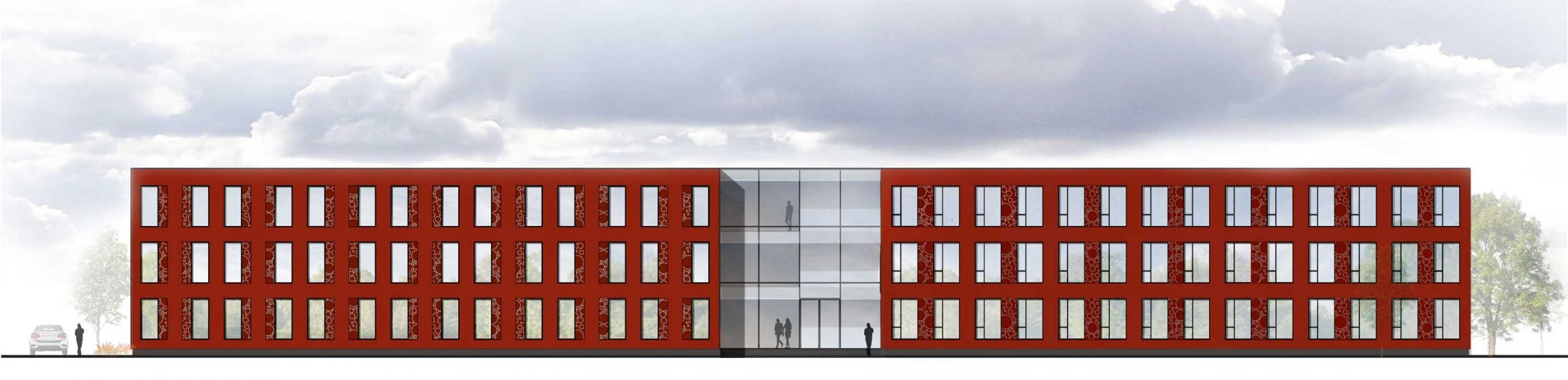 Die vorgesehene Fläche mit einer maximalen Tiefe von ca. 28 Metern zwischen der Fahrbahn und der Grenze der benachbarten JVA bietet Platz für ein zweihüftiges Gebäude. Diese Position ermöglicht kurze Wege von und zu den Bestandsgebäuden und zu den PKW-Parkplätzen.