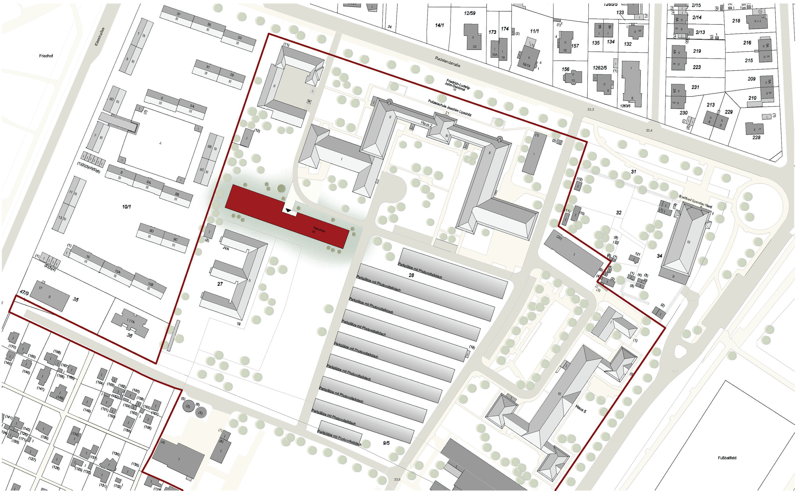 Die vorgesehene Fläche mit einer maximalen Tiefe von ca. 28 Metern zwischen der Fahrbahn und der Grenze der benachbarten JVA bietet Platz für ein zweihüftiges Gebäude. Diese Position ermöglicht kurze Wege von und zu den Bestandsgebäuden und zu den PKW-Parkplätzen.