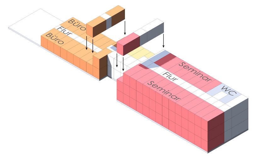 Der Ersatzneubau ist dreigeschossig ohne Keller geplant. Der Zugang des Gebäudes erfolgt über die Nordseite. Die Fassade der Eingangszone ist eingerückt und bildet äußerlich die Fuge zwischen den Gebäudebereichen. Eine gläserne Fassade öffnet das Gebäude zu einer Hofzone, die sich auch am gegenüberliegenden Bestandsgebäude wiederfindet. Die Eingangszone mit dem zentralen Treppenhaus und einem Aufzug gliedert das Gebäude in zwei Bereiche: Westlich schließt der Gebäudeteil der Seminarräume an und östlich der Bereich der Büroräume. Der Seminarbereich hat eine Gebäudetiefe von 17,50 Meter und der Bürobereich eine Gebäudetiefe von 13,80 Meter. Die Erschließung erfolgt über einen zentralen Flur, an dessen Ende jeweils die notwendigen Treppenhäuser und WC-Anlagen liegen. Pro Geschoss ist ein Besprechungsraum vorgesehen und zentral neben dem Haupttreppenhaus ein Aufenthaltsraum mit Teeküche. Das Gebäude wird behindertengerecht erschlossen und alle Geschosse werden über einen Aufzug erreicht.