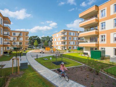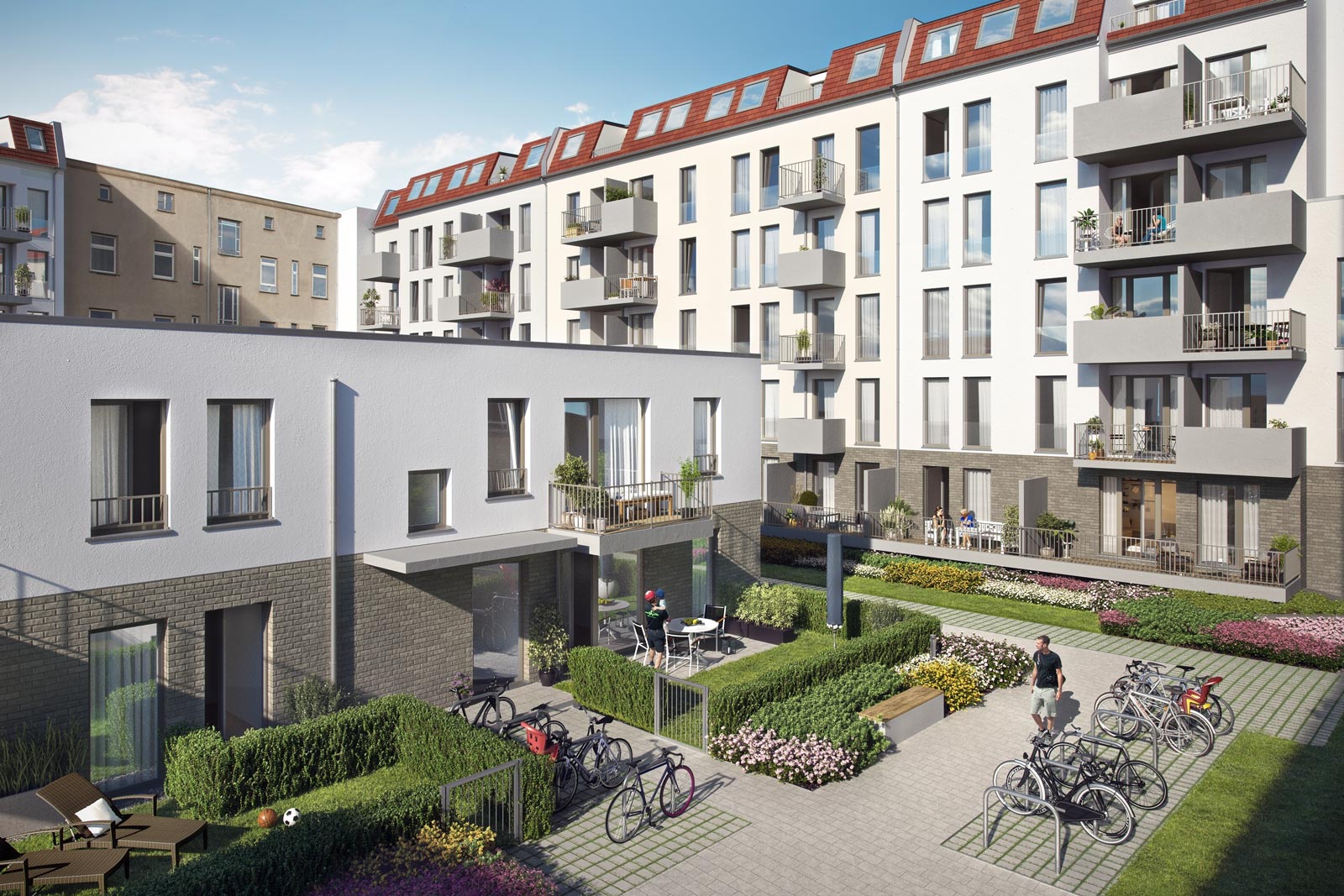 Alle Häuser sind unterkellert. Außerdem entsteht eine zentrale Tiefgarage mit direktem Zugang zu zwei Häusern. Die Erschliessung der Tiefgarage erfolgt über die Langhansstraße. In zwei Häusern werden die Wohnungen eines Geschosses barrierefrei und uneingeschränkt mit dem Rollstuhl nutzbar errichtet. Die Duschen bzw. Badewannen in den Bädern sind umbaubar, so dass die erforderlichen Bewegungsflächen ebenfalls erfüllt werden.