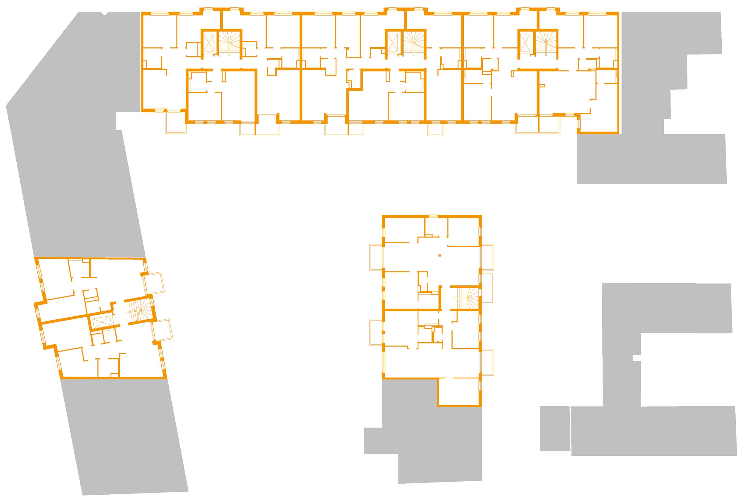Die neuen Mehrfamilienhäuser schliessen zwei Baulücken einer ursprünglich geschlossenen Bebauung im Erhaltungsgebiet Weißenseer Spitze. An der Langhansstraße und an der Prenzlauer Promenade gelegen, vervollständigen sie die Fassadenfluchten und damit wieder den städtischen Raum. Die beiden strassenseitigen Häuser haben sechs oberirdische Geschosse, das Hofhaus ist zweigeschossig.