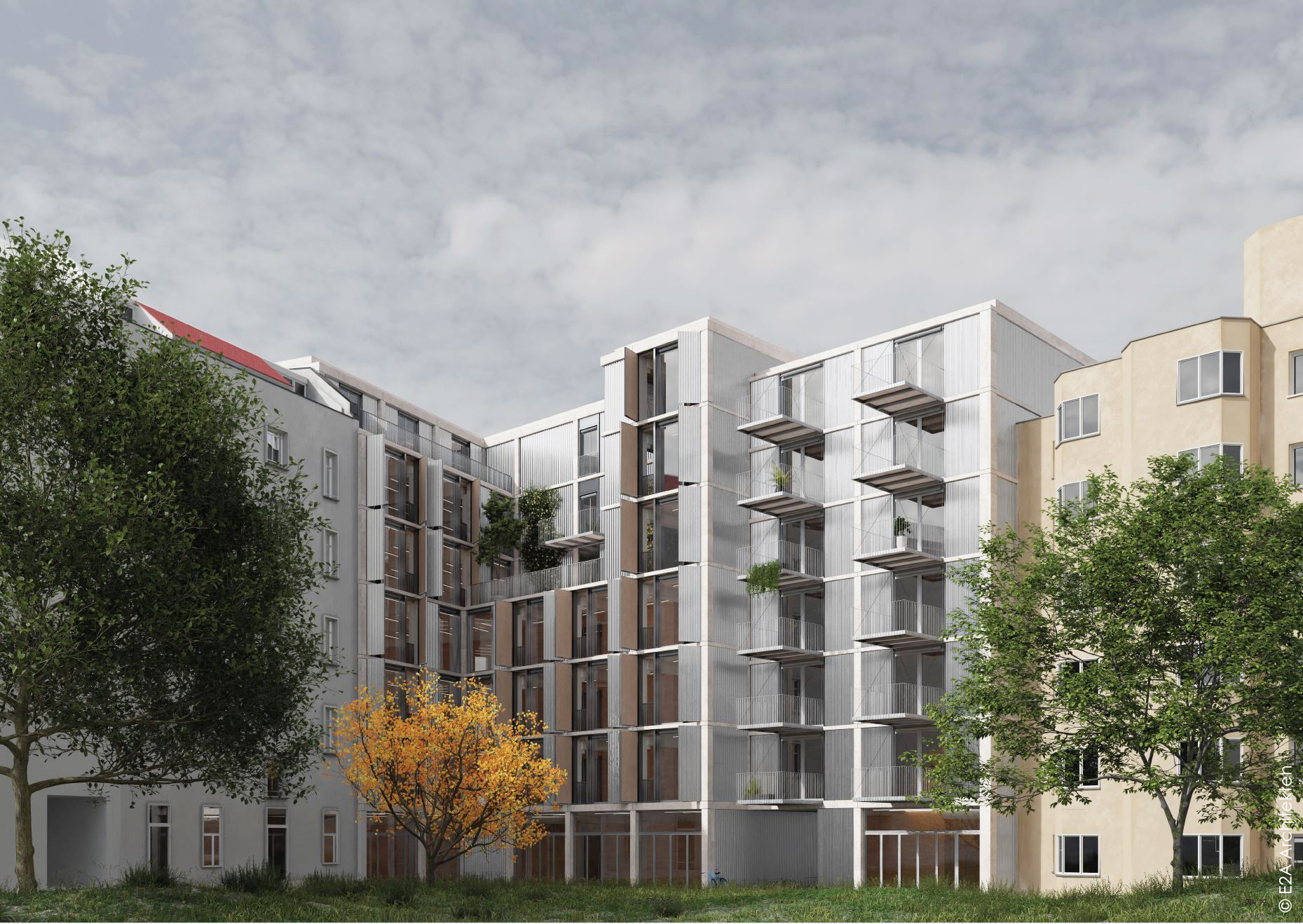 Das Projekt entsteht an einer der wichtigsten Nord-Süd-Achsen Berlins – der Müllerstrasse. Der direkt angrenzende S-Bahnhof Wedding bietet eine hervorragende Verkehrsanbindung. Geplant ist ein Wohn- und Geschäftsgebäude in Holz-Hybridbauweise – entworfen von E2A Architekten. Geschossdecken und Außenwände werden als Holzkonstruktion ausgeführt. Stützen, Unterzüge und die aussteifenden Treppenhauskerne, sowie das Untergeschoss und die Decke des Erdgeschosses, werden aus Stahlbeton errichtet. Die Fassaden zur Straße werden mit Photovoltaik-Paneelen versehen. Die Dachflächen werden als extensiv begrünte Retentionsdächer realisiert. Hier werden Photovoltaik-Elemente aufgestellt.