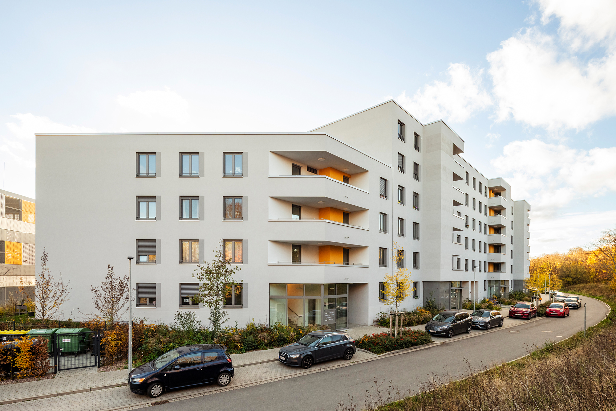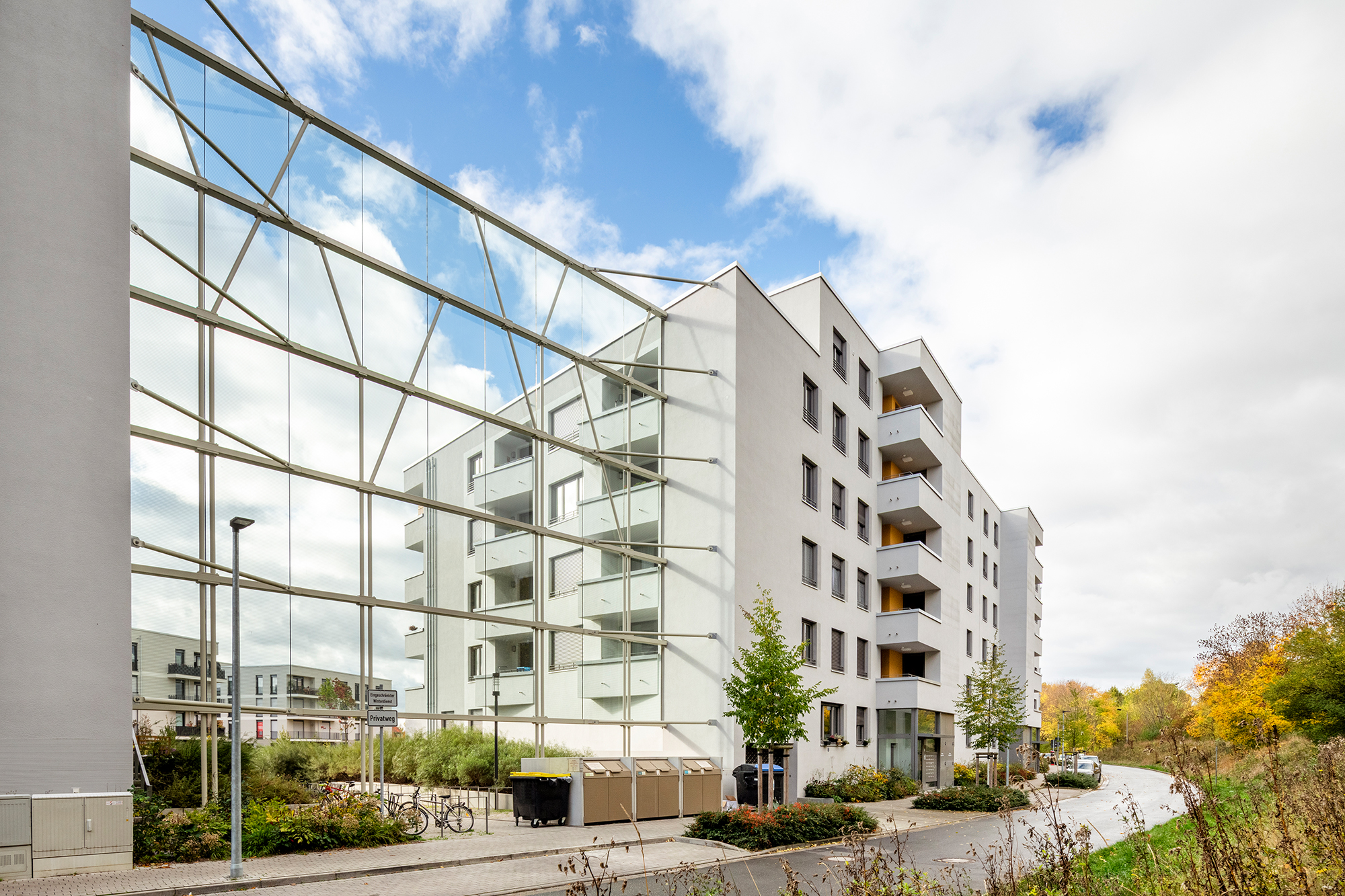 Einen grossen Teil dieser Bebauung bildet der geschlossene Ring entlang des nördlichen Bogens mit insgesamt 288 Wohnungen. Die drei Gebäude werden durch Schallschutz-Glaswände verbunden, die die Wohnanlage, die parkähnlich gestaltet wird, vor Schallimmissionen schützt.