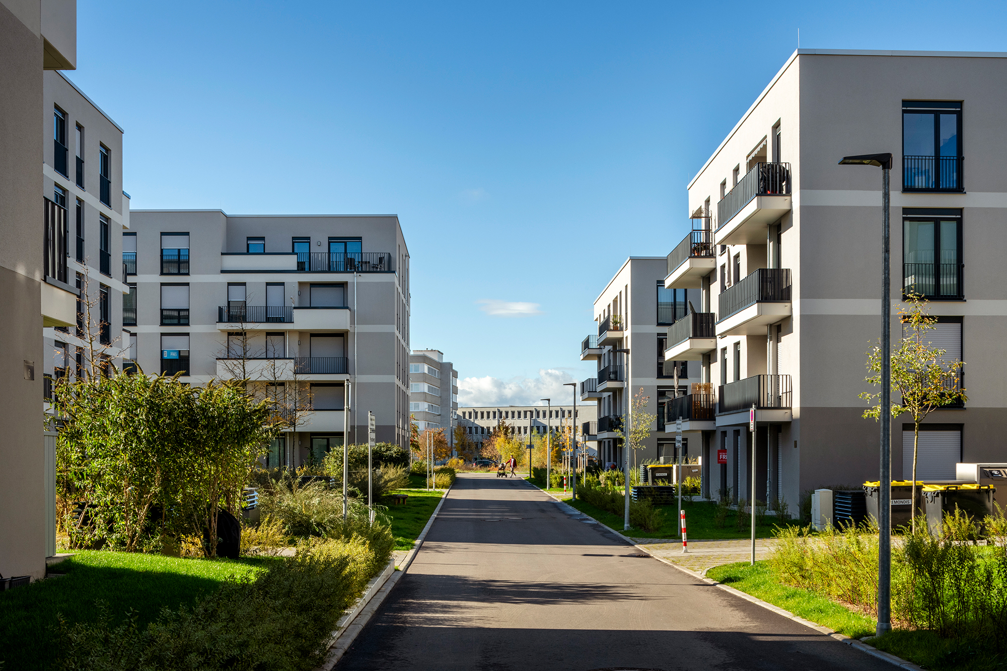 Um kostengünstig Wohnraum zu schaffen, hat unser Planungsteam effiziente Wohnungstypen entwickelt, die in den einzelnen Häusern wiederkehren. Die Grundrisse sind so organisiert, dass nur ein Versorgungsschacht pro Wohnung benötigt wird. Die Badezimmer dienen als zentrale Versorgungseinheiten, sie wurden einschliesslich Installation als vorgefertigte Raum-Module geplant. Jede Wohnung verfügt zudem über einen Freisitz mit vorwiegend Südorientierung. Um den Mietern im Erdgeschoss Terrassen mit Grünflächen zu ermöglichen, wurde auf Feuerwehrzufahrten auf dem Gelände der Wohnanlage verzichtet. Der Brandschutz wird über Sicherheitstreppenräume auf der Nordseite realisiert. Diese bewirken, dass Erschliessungsflächen und die Anzahl der benötigten Aufzüge reduziert werden können.