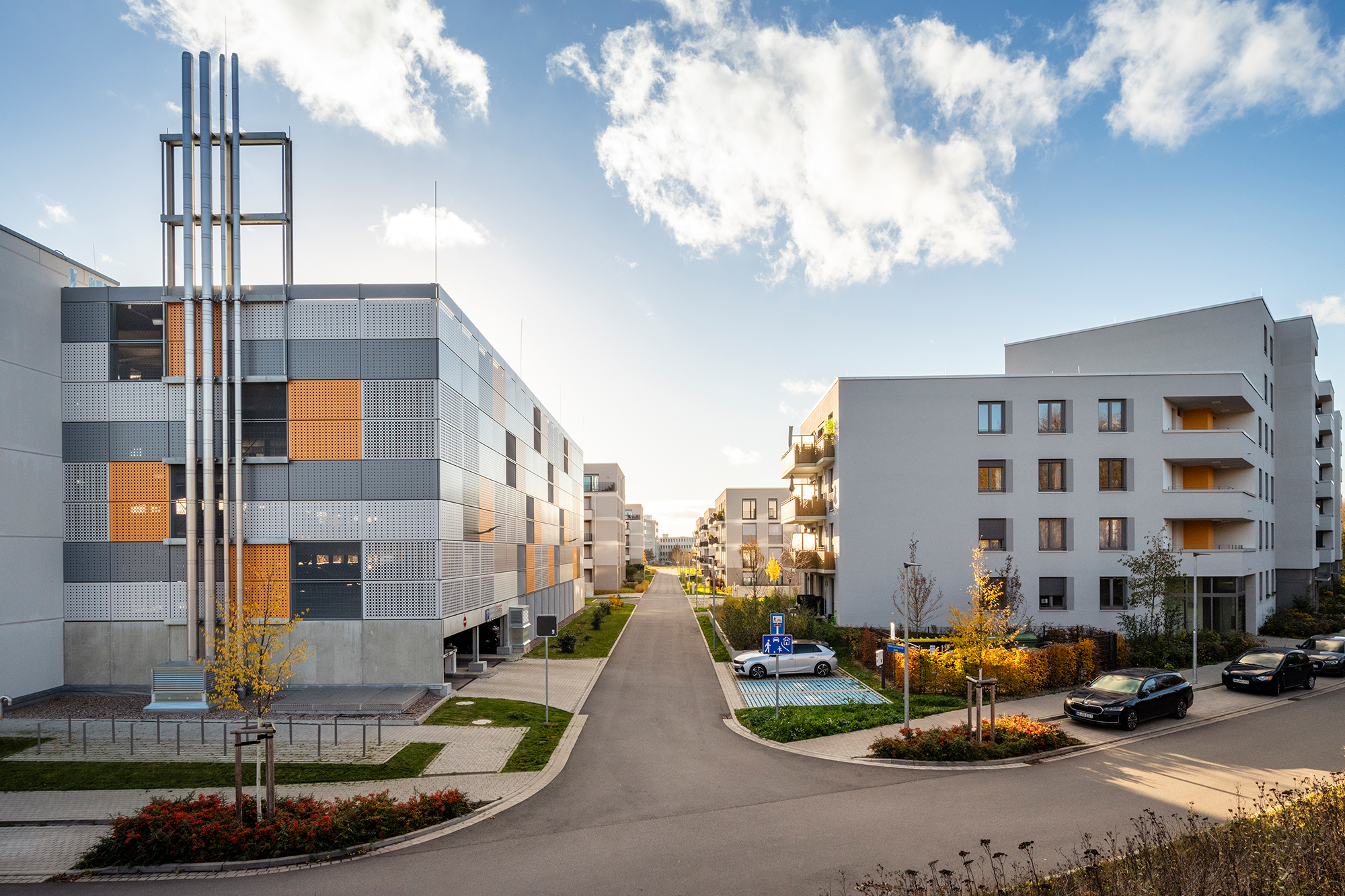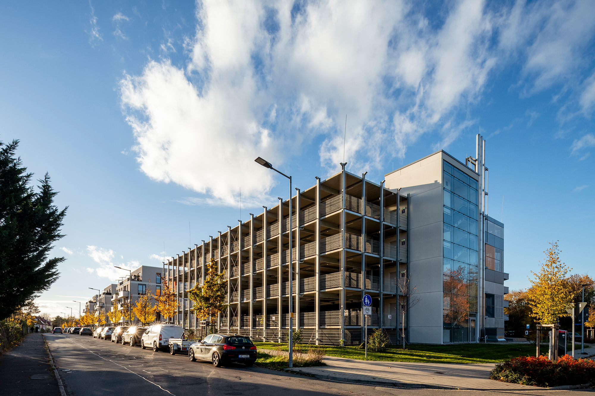 Das Quartiersparkhaus mit Fassadenelementen aus Keramikziegeln und verschiedenen Lochblechen wird in Elementbauweise mit einem hohen Vorfertigungsgrad aus Stahl und Stahlbeton erstellt. Im Untergeschoss des Parkhauses befindet sich ein Blockheizkraftwerk, das das gesamte Quartier mit Wärme und Strom versorgt. Dieses Nahwärmenetz ist effizient und wirtschaftlich.