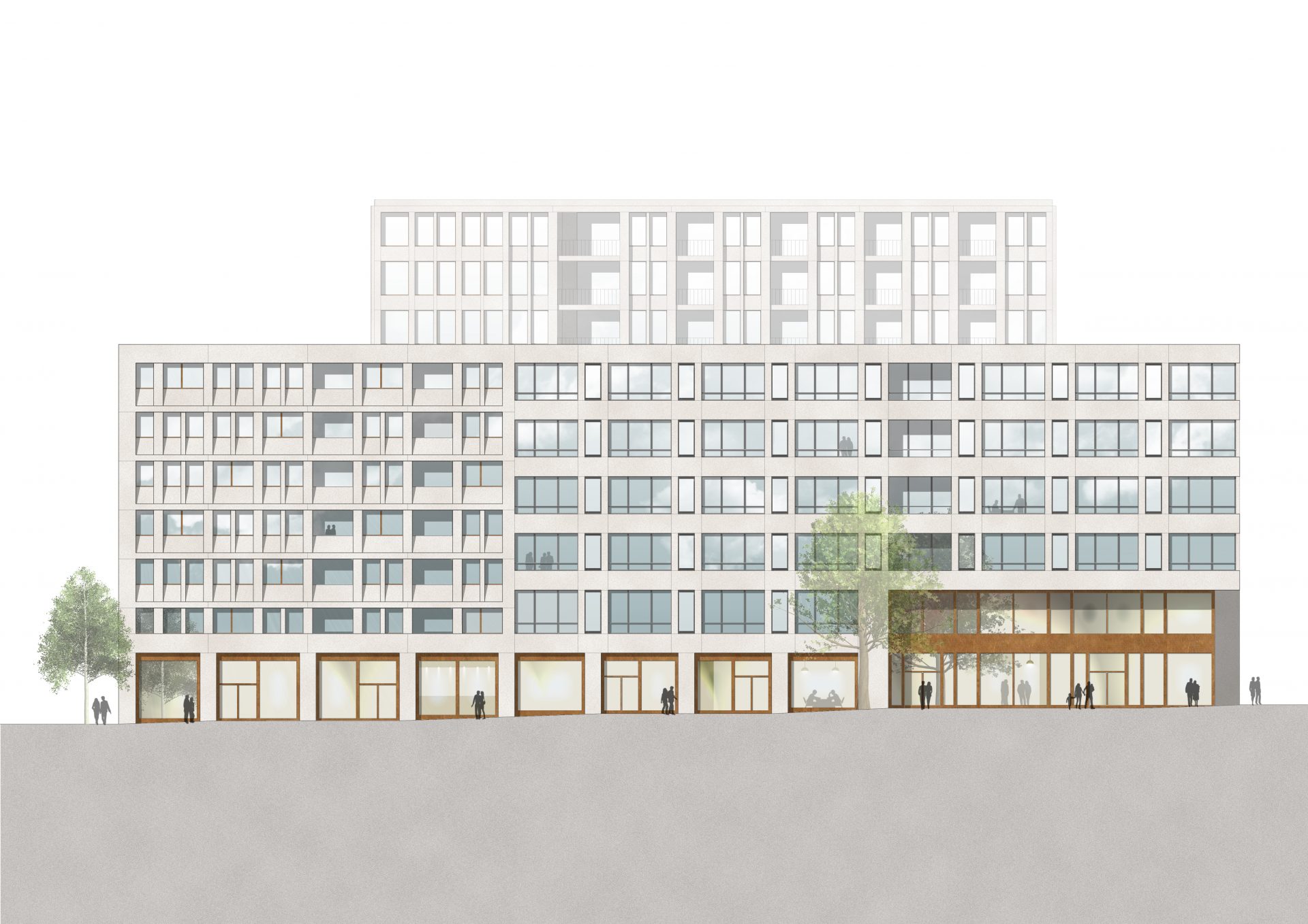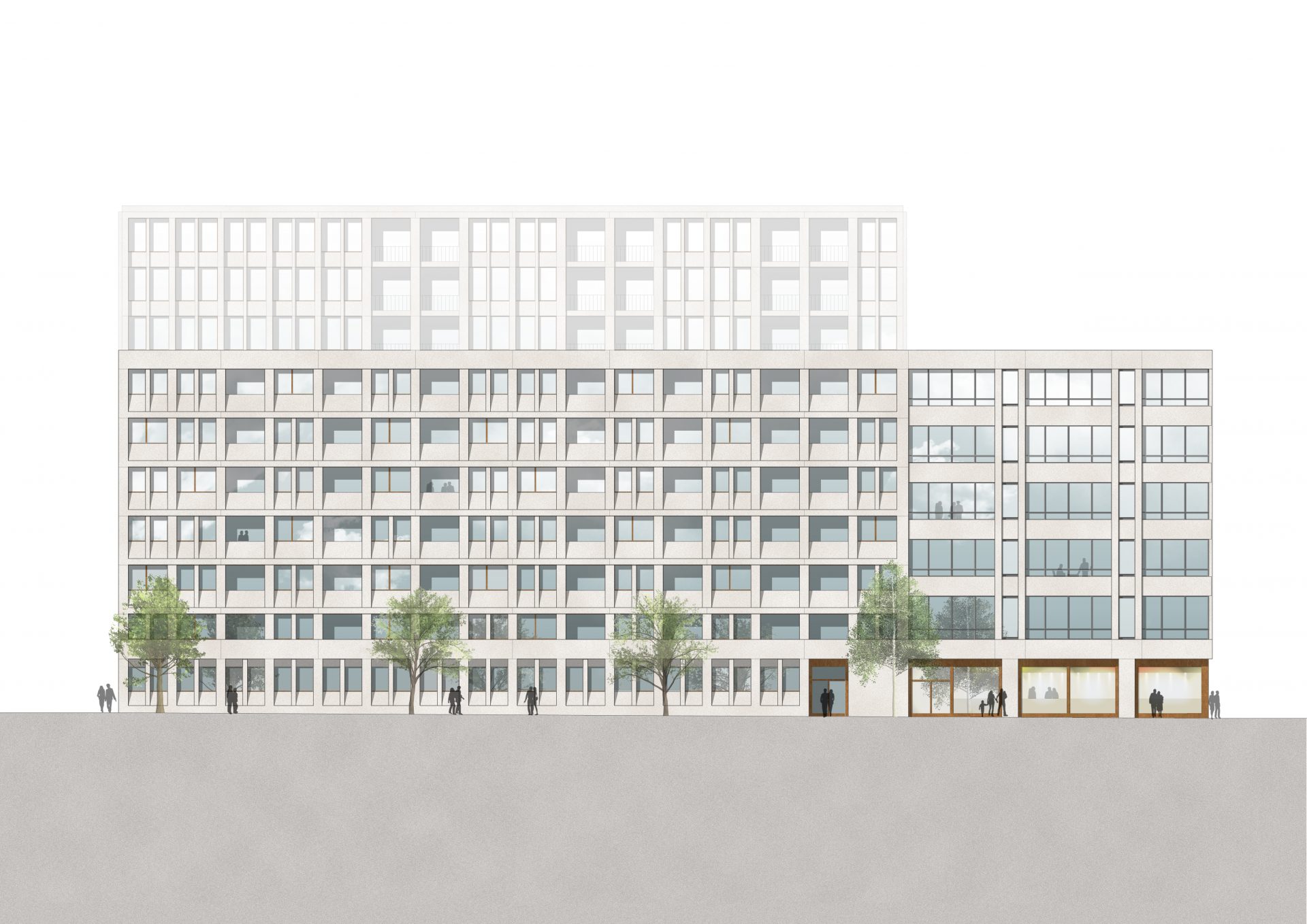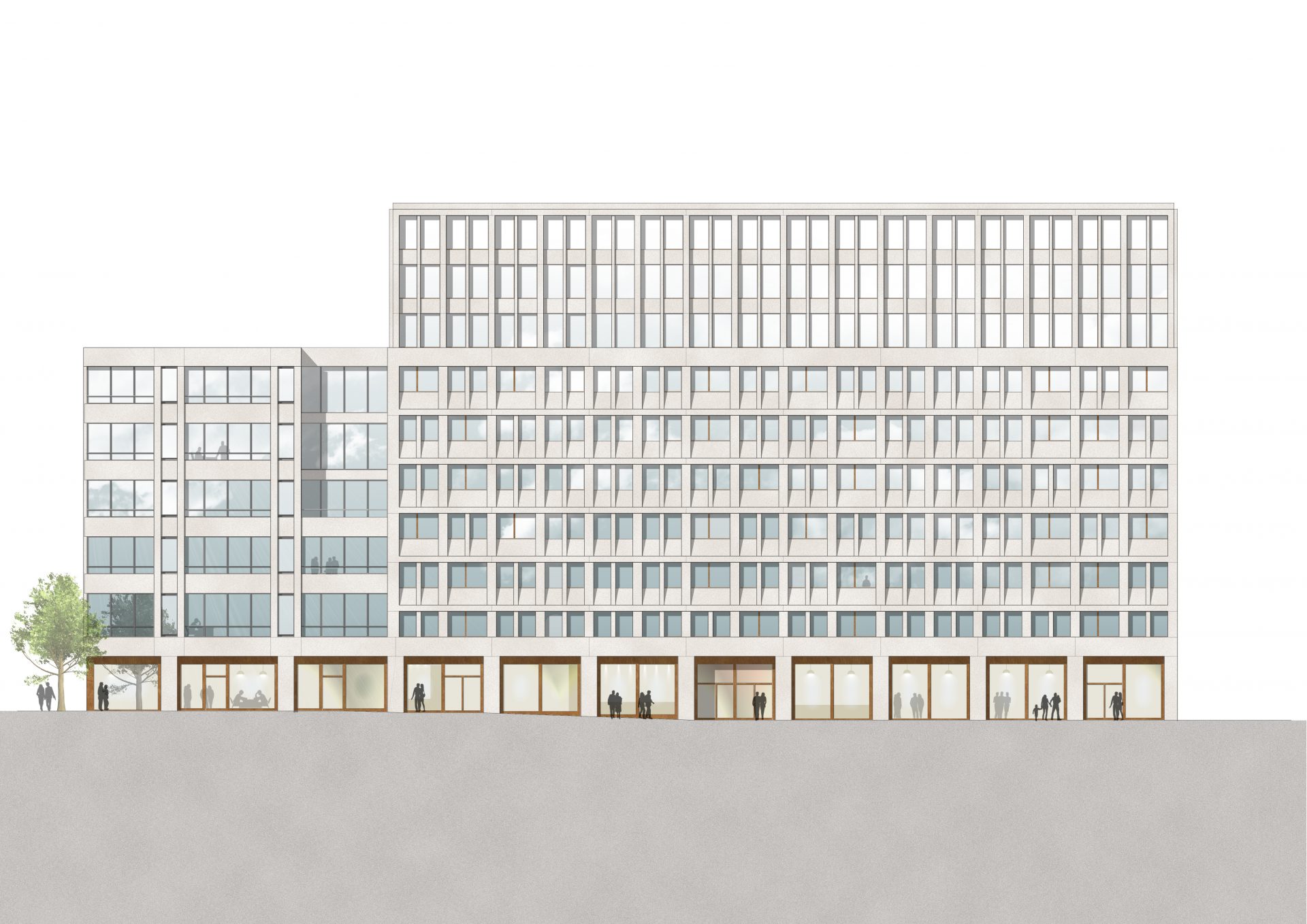 Die Materialität der beiden Blöcke aus pigmentierten Betonfertigteilen, Glasfaserbeton, Glas und eloxierten Aluminiumprofilen sowie der belebende Sockel mit Einzelhandel und Gastronomie verbindet die beiden verschwisterten Blöcke und lässt eine neue Nachbarschaft entstehen.