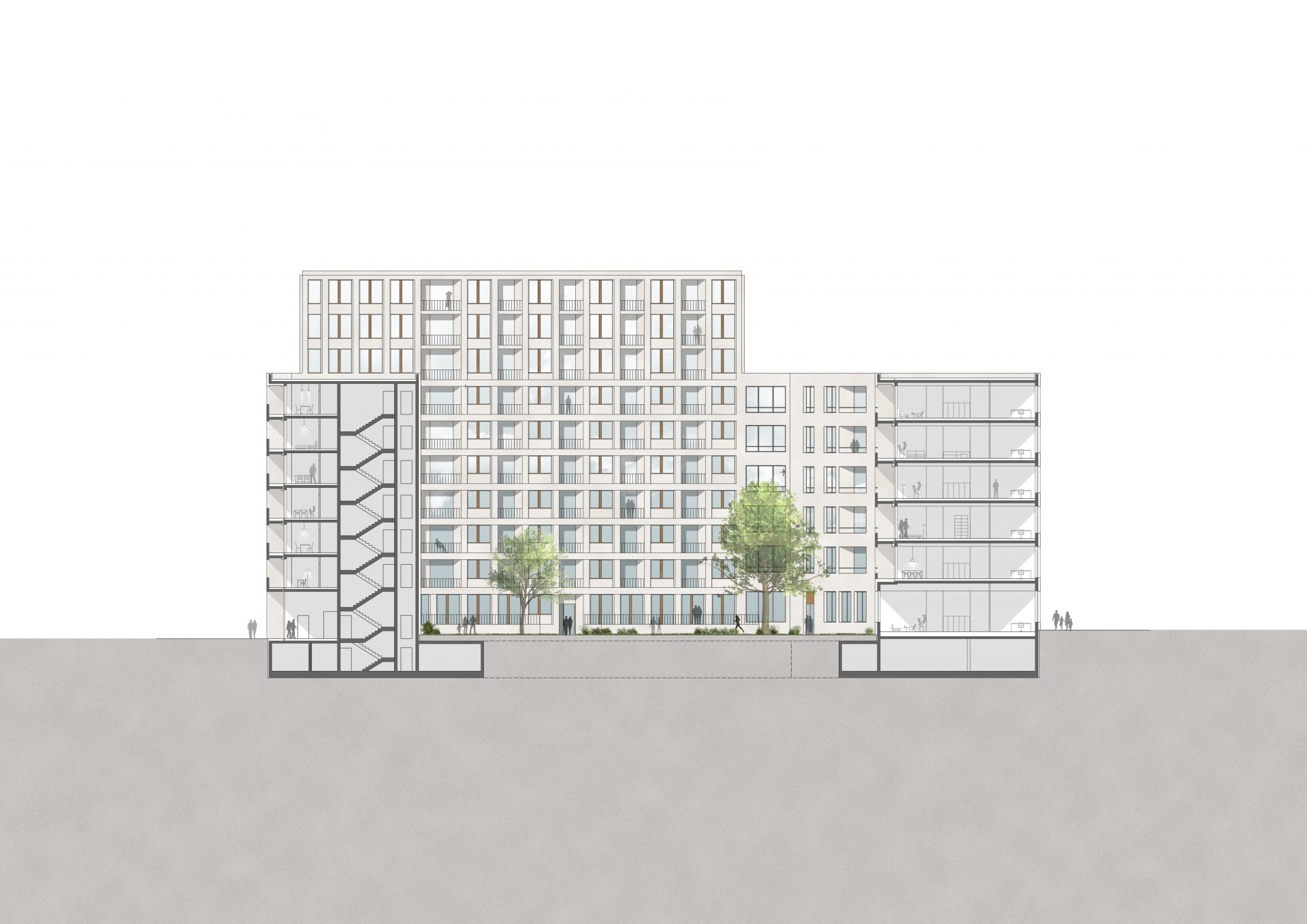 Die beiden Blöcke beherbergen im Erdgeschoss zum Nordhafenplatz und zur Heidestraße hin grossflächig verglaste Gastronomie- und Gewerbeeinheiten, die die Gebäude mit dem Nordhafenplatz und dem Aussenraum verbinden und eine urbane Mischung ermöglichen. An den Westseiten sind Studio-Wohnungen für eine zukunftsweisende Verknüpfung von Arbeiten und  Wohnen vorgesehen. Die Wohnungen liegen leicht über Strassenniveau und bieten zur Strassenseite einen kombinierten Arbeits- und Showroom mit Schaufenster zur Stadt. Die privaten Bereiche liegen auf einer höheren Ebene und orientieren sich zum Innenhof mit einem privaten Balkon.