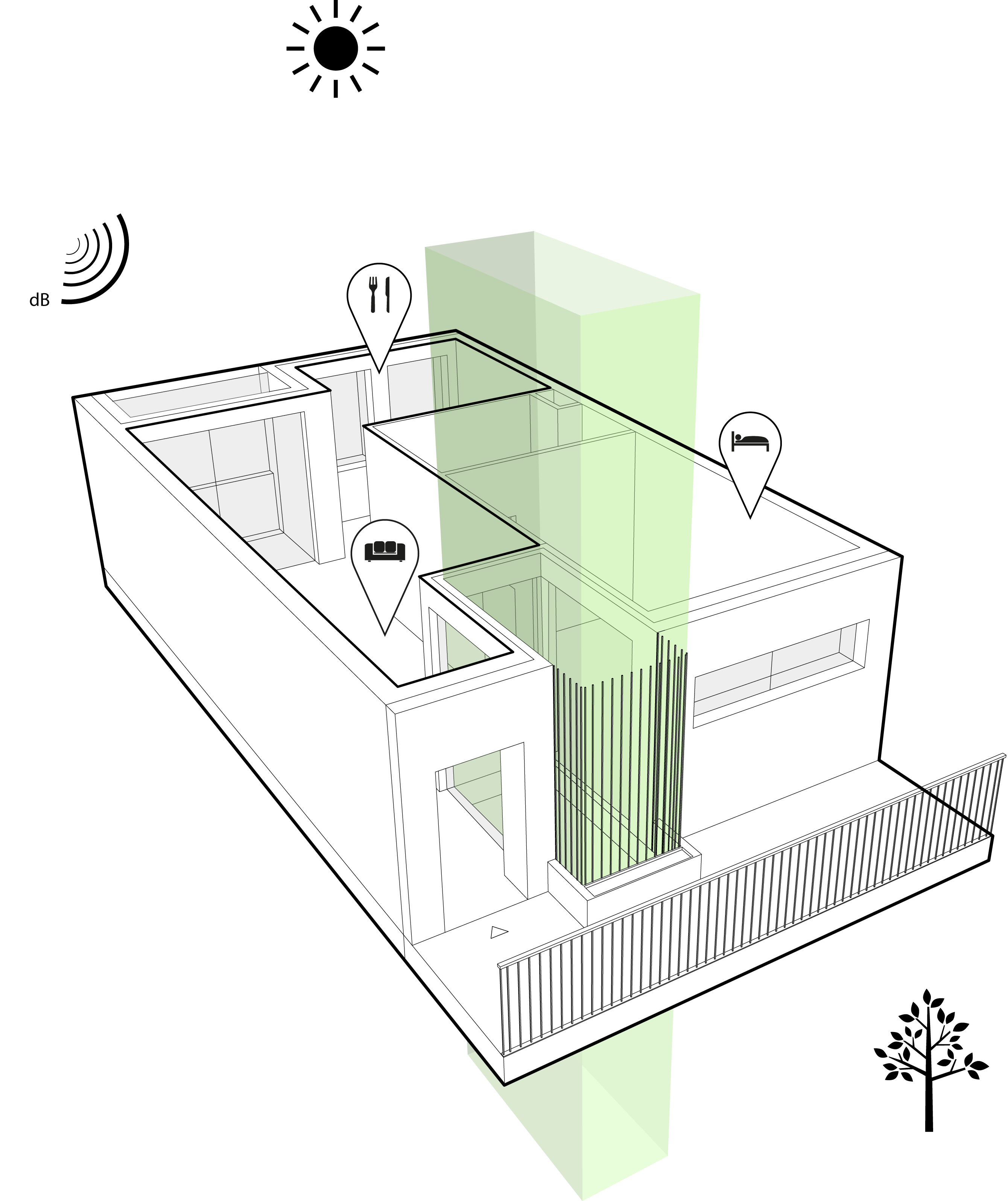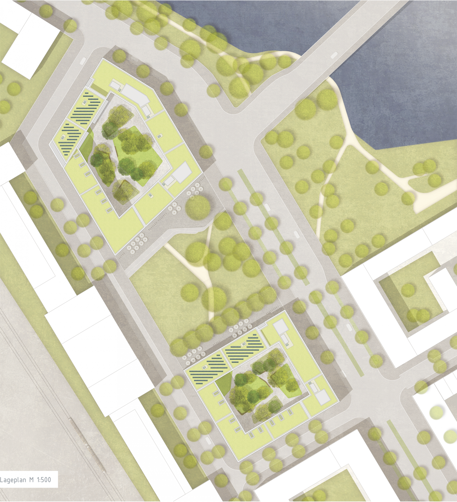Die zu den Planstrassen gelegenen Wohnungen werden in den oberen Geschossen durch zum Innenhof liegende Galerien erschlossen. Jeder Wohnung wird ein begrünter Lichtgarten zugeordnet, der die Galerien strukturiert und Identität stiftet. So wird die innen liegende Fassade begrünt und optisch mit dem Innenhof vernetzt. Es entsteht eine grüne Insel inmitten der beiden innerstädtischen Wohnblöcke. Die Gestaltung der Innenhöfe gliedert sich in kleine Platzsituationen und mehrere grüne Inseln. Die Inseln nehmen verschiedene Nutzungen wie Aufenthalt, Spiel und Fahrradstellplätze auf und integrieren diese unterschiedlichen Funktionen in einer Formensprache.