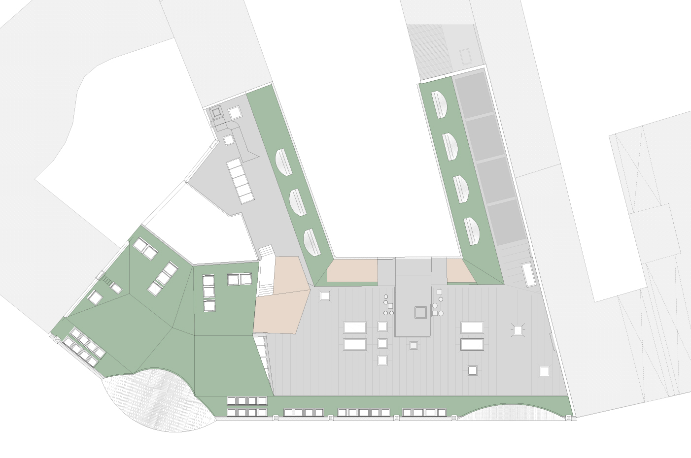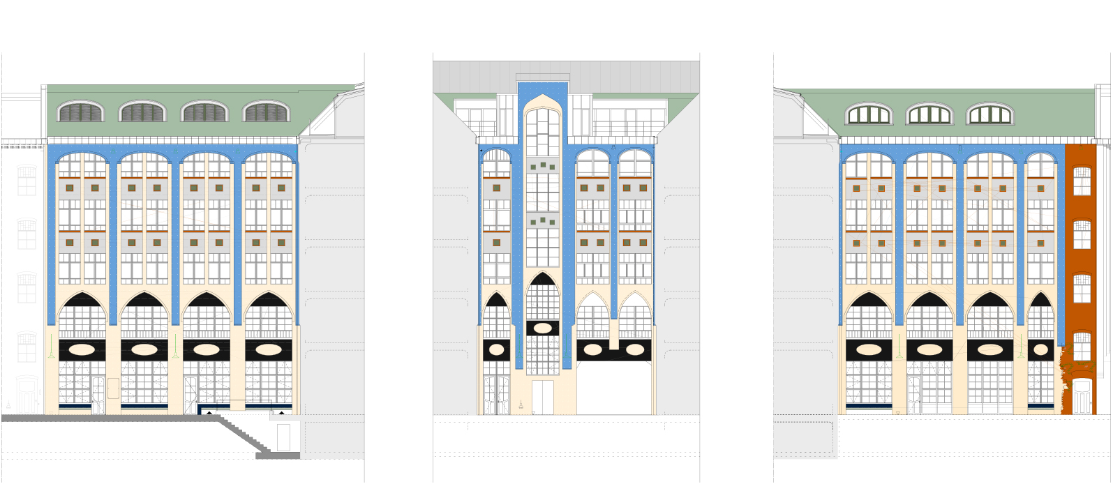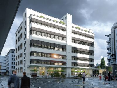 Bestandteil des Projekts ist die Installation einer zentralen Kälteversorgung für rund 6.000 m² Bürofläche im gesamten Ensemble. Aus denkmalrechtlichen Gründen werden die Rückkühler und dezentralen Kälteanlagen im Dachgeschoss des nördlichen Seitenflügels positioniert. Zusätzlich werden die Fenster in den weiterhin als Büroflächen genutzten Dachbereichen erneuert und die eingerüsteten Fassadenbereiche an der Straße sowie in den betroffenen Innenhöfen denkmalgerecht instand gesetzt.