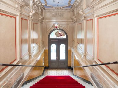 Im zentralen Eingangsfoyer und Haupttreppenhaus sind sowohl die bauzeitlichen Marmorbekleidungen als auch die Decken im Jugendstil und einige bauzeitliche Messingbauteile im Original erhalten.